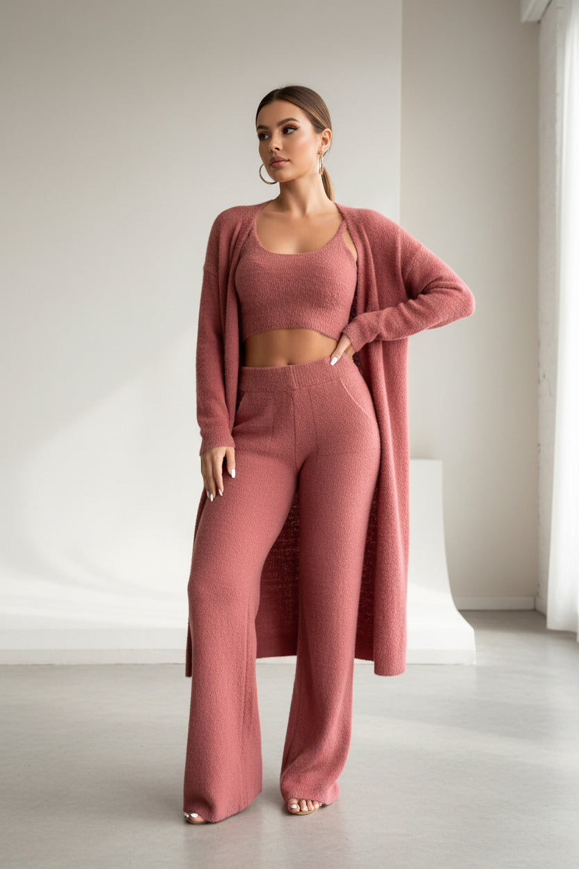 👗 3-teiliges Set für vielseitige Styles: Das Set besteht aus einem Trägertop, einer hochgeschnittenen Hose und einer offenen Strickjacke – endlose Kombinationsmöglichkeiten.